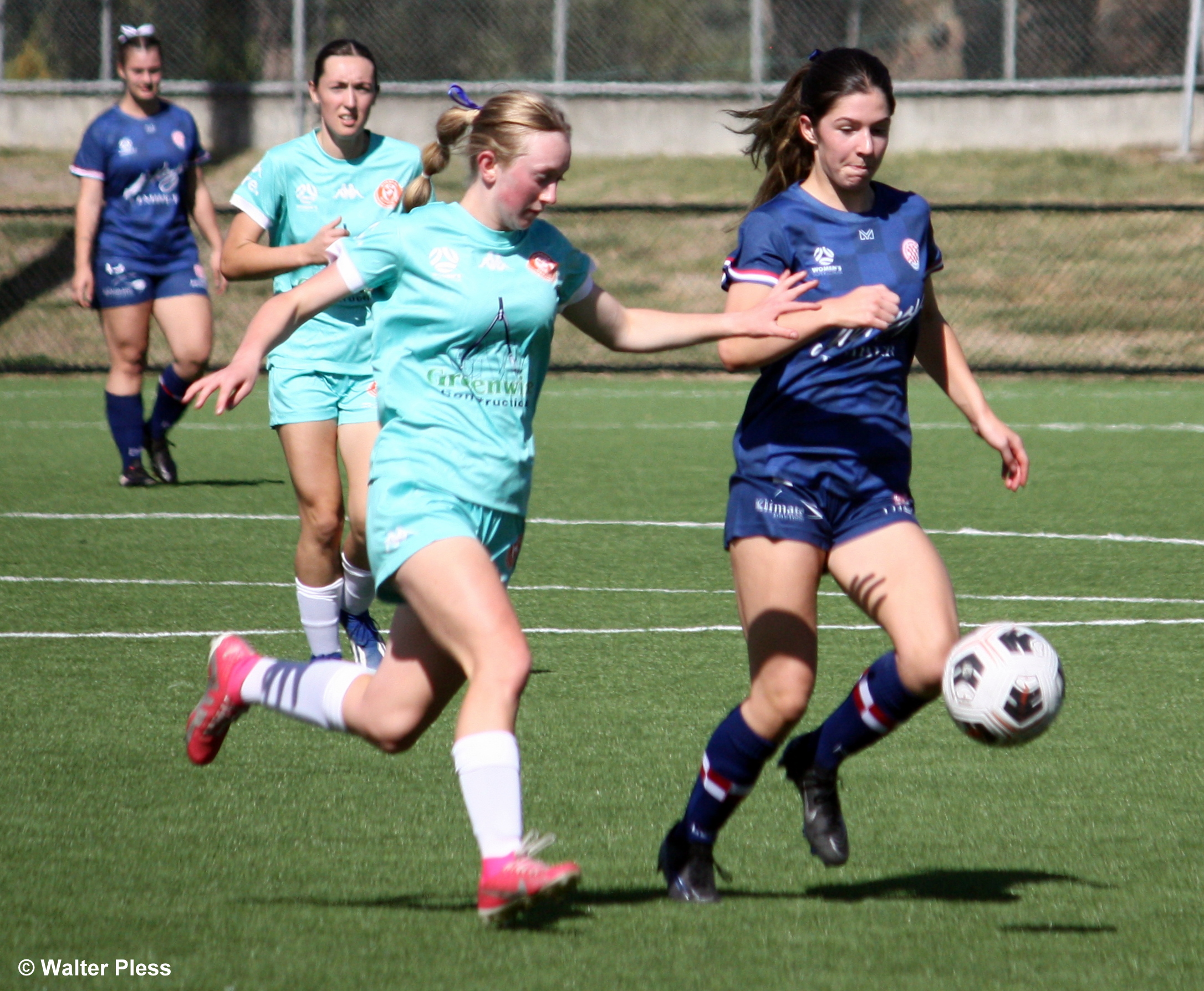 Photo: Glenorchy Knights' Charlotte Butler in a race for the ball with a Riverside Olympic opponent. [PlessPix]